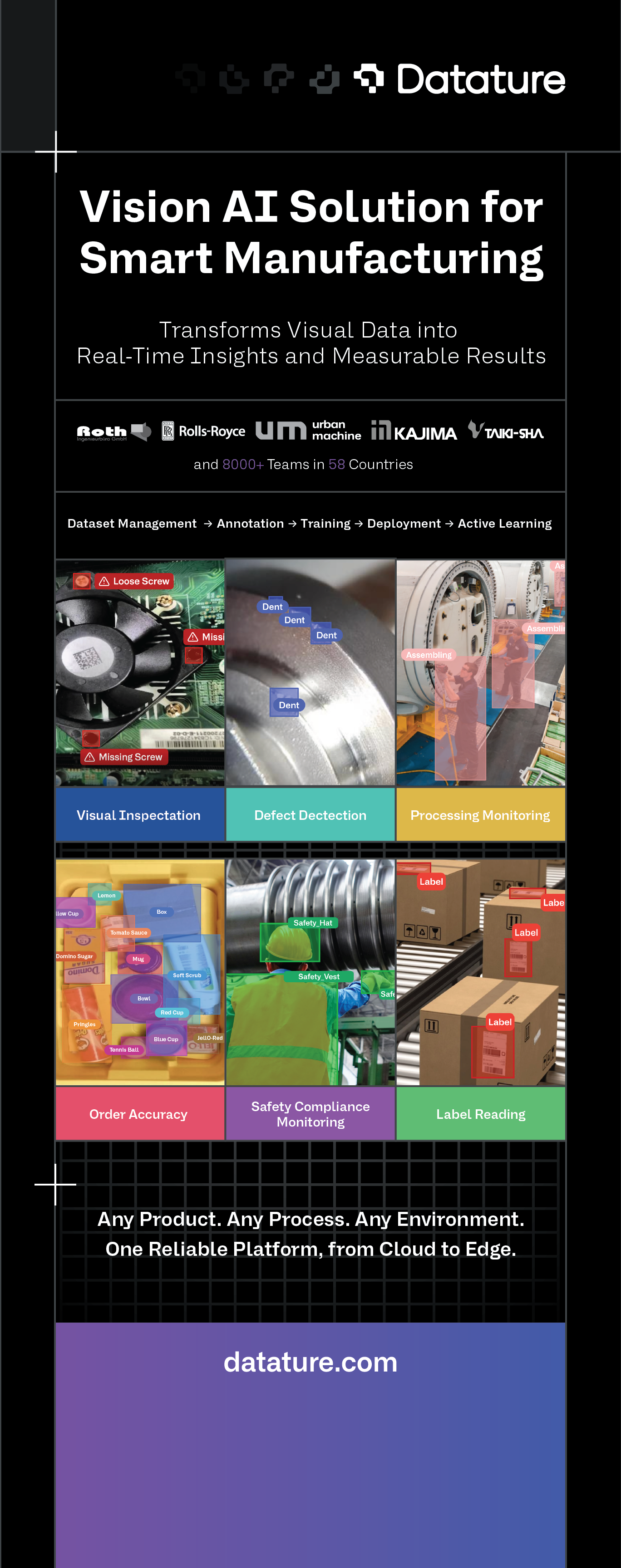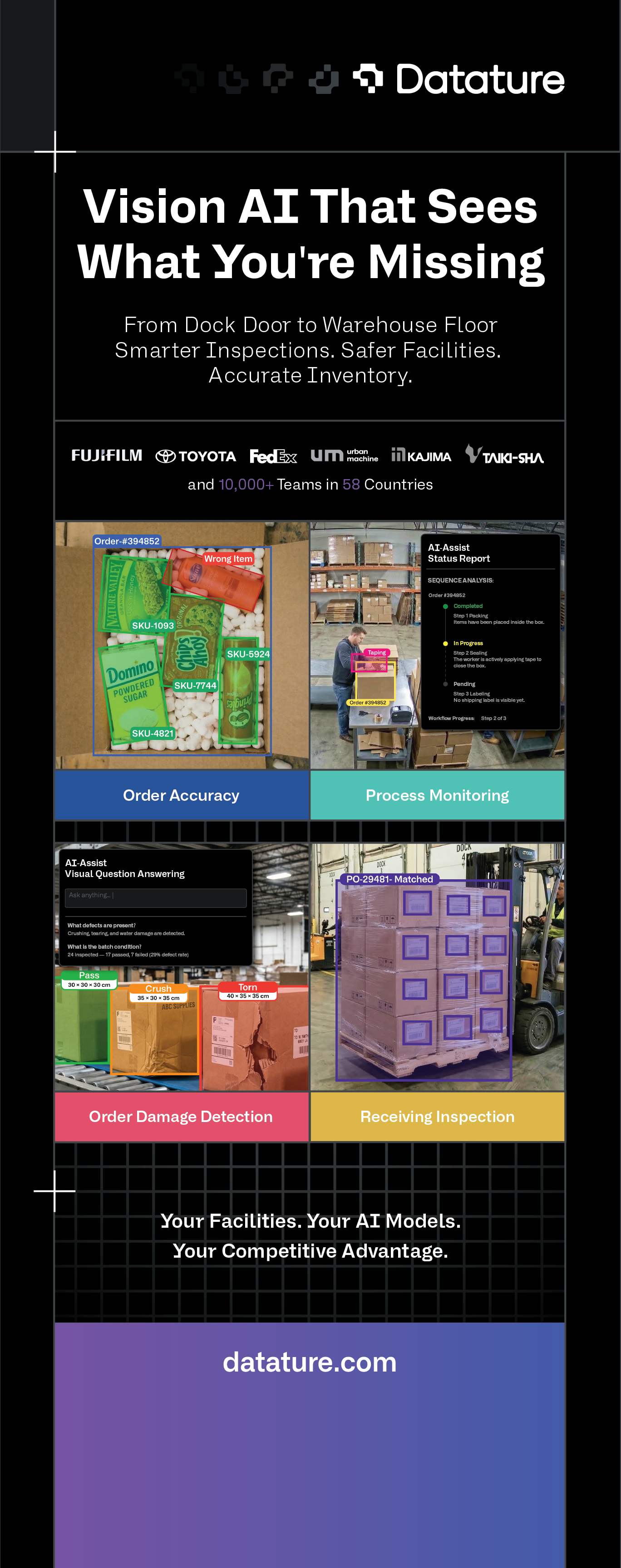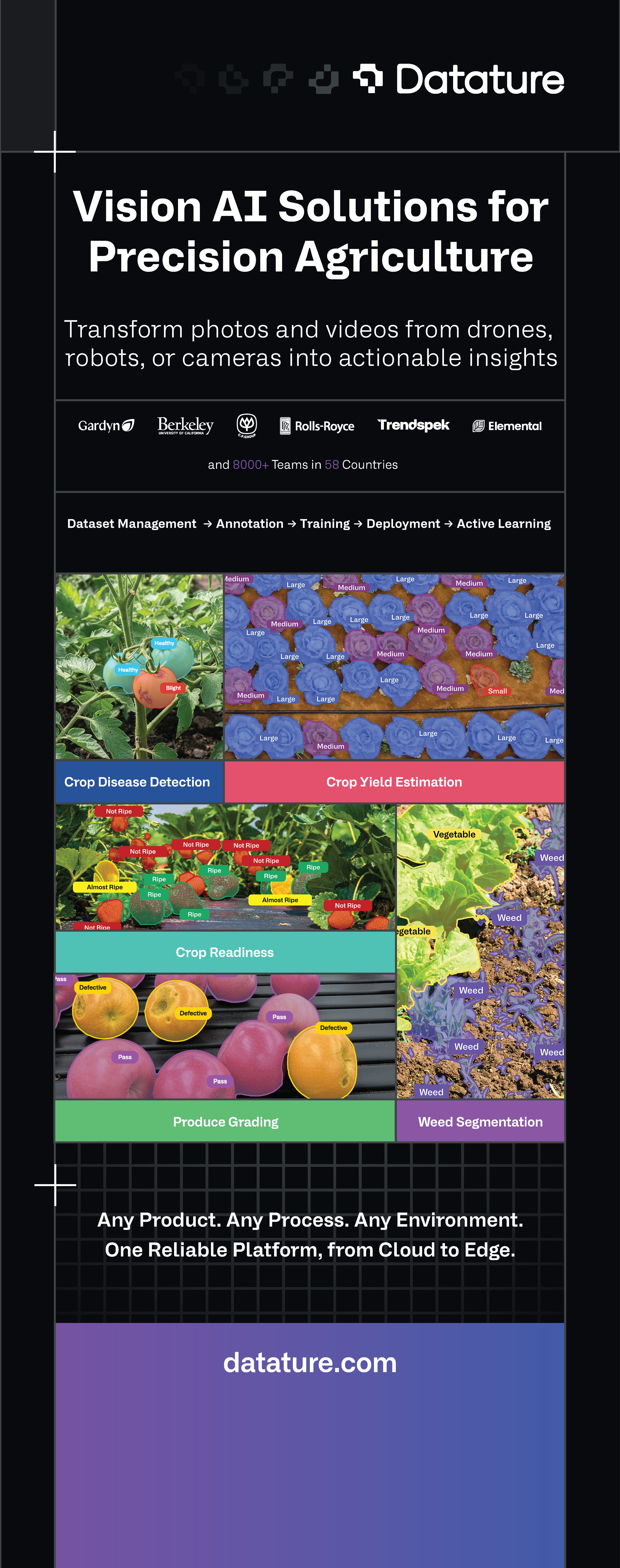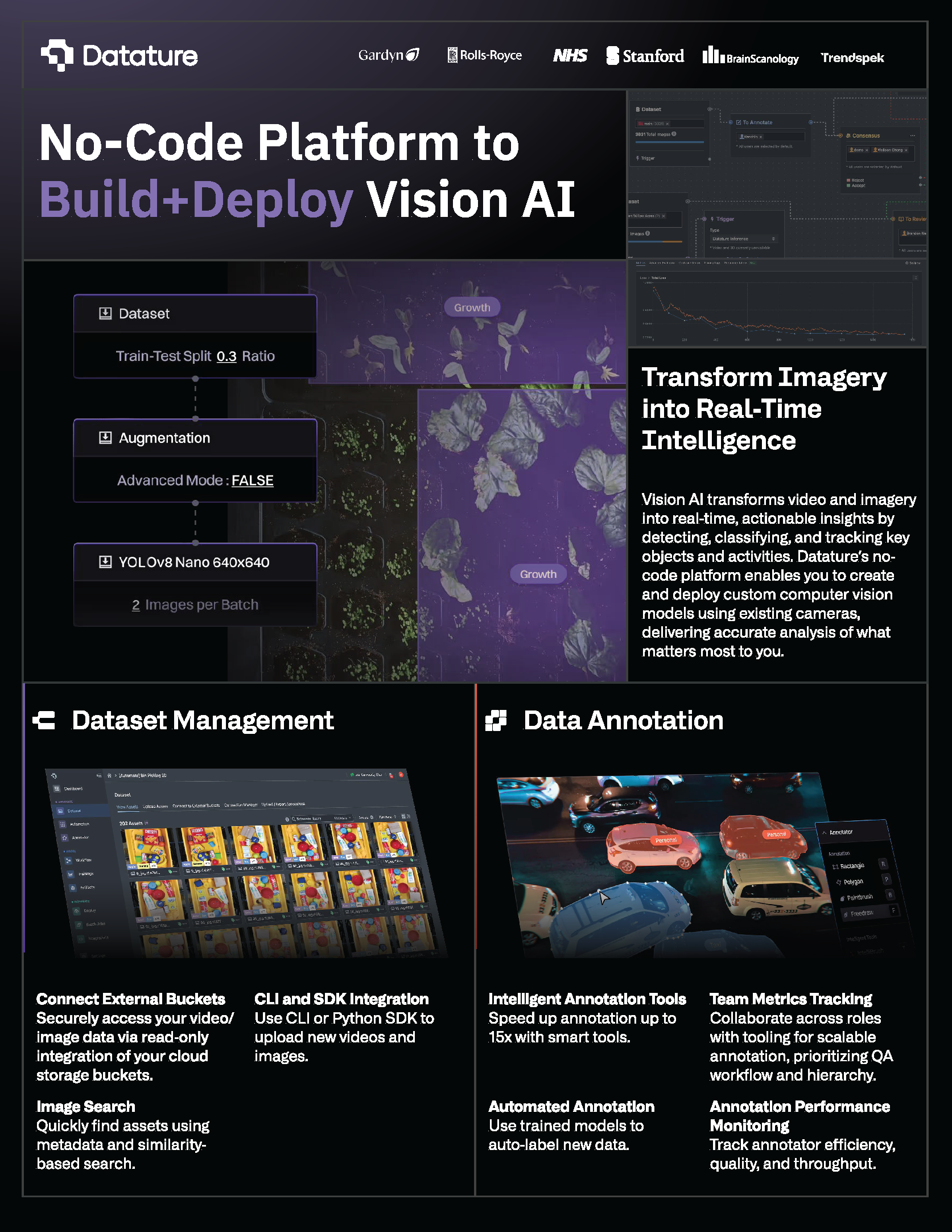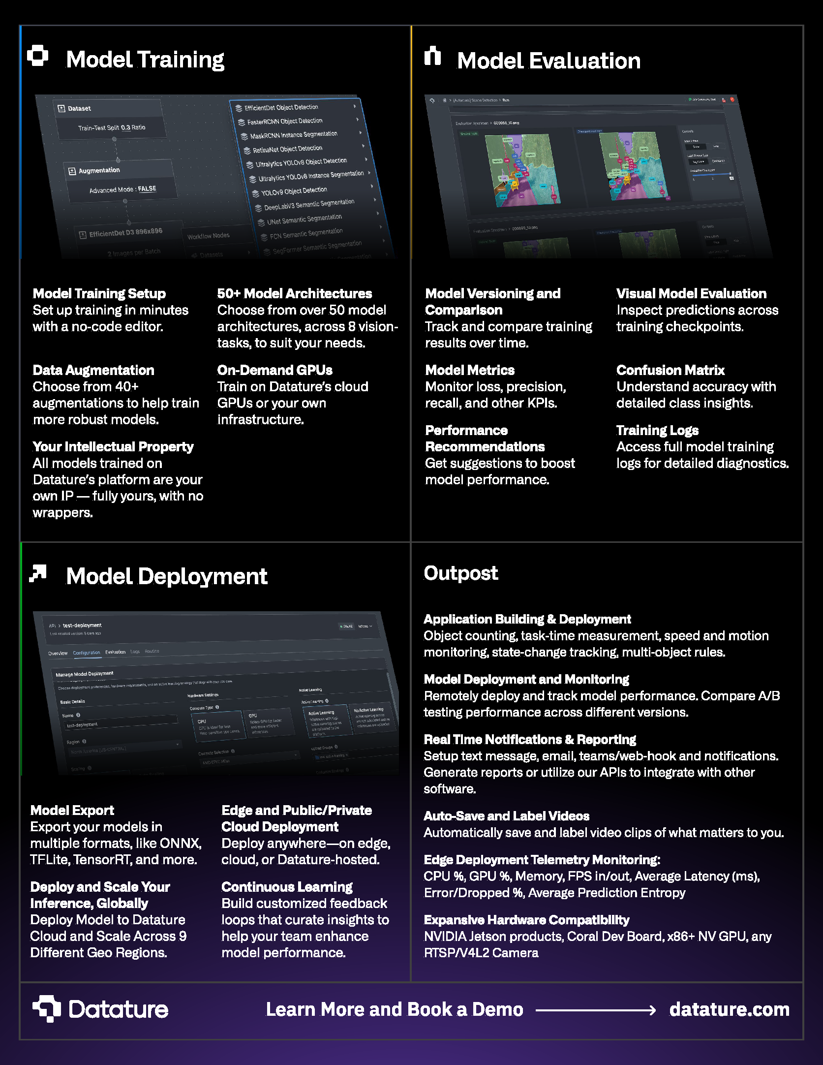 A Singapore- and US-based Vision AI startup providing an end-to-end platform for building, training, and deploying computer vision models, enabling organizations to operationalize visual data. Designed for real-world applications, Datature transforms visual data into actionable insights across industries such as manufacturing, agriculture, healthcare, logistics, etc.